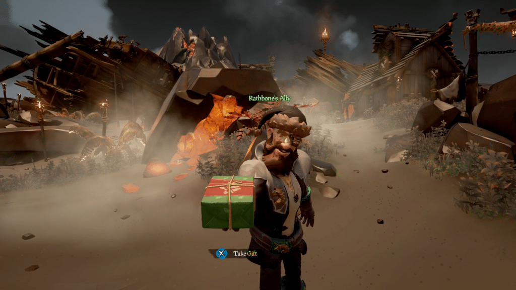 Once you find a Pirate Legend, wait for them to perform the Emote, and walk up to the present they are holding out. You should see a prompt that says, “Take Gift.”